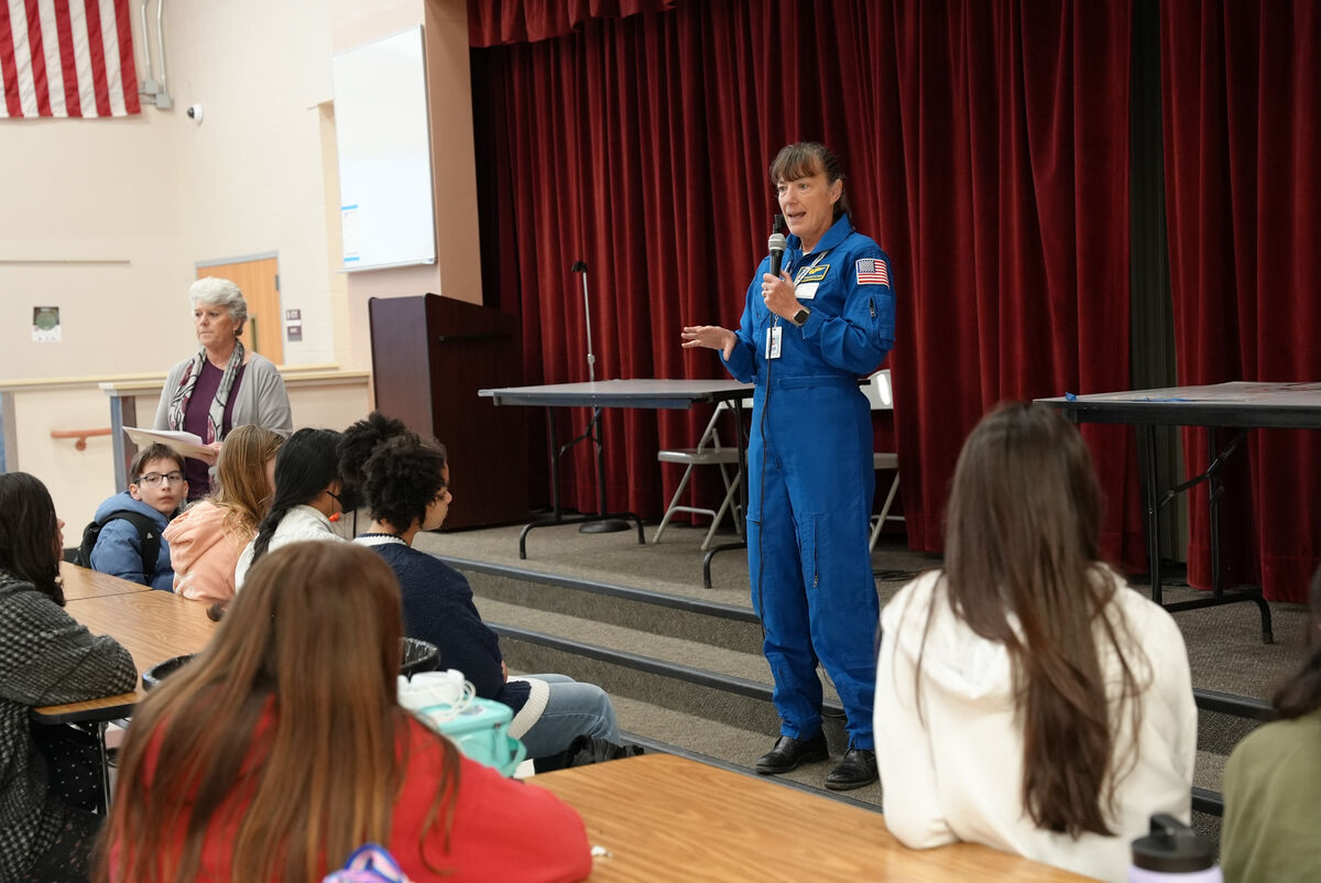 Former Astronaut and Oak Harbor resident Heidimarie Stefanyshyn-Piper surprised Ms. Fisken's math class at North Whidbey Middle School on Tuesday, February 21, 2024. Ms. Fisken organized the visit following a class assignment that was focused on solving an algebra problem for NASA. When Stefanyshyn-Piper arrived in class, the students exclaimed with excitement about the surprise visit.